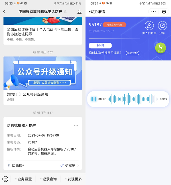 头盔男 发表于 2023-7-18 10:55 移动跟电信都有ai代接服务,疑似营销号码的ai代接,然后微信上推送录音给你,防止误判 我的号码经常发生双 ...